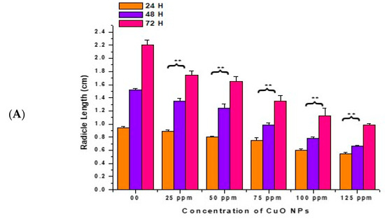 In the control, the RL increased with a surge in time (0.94 ± 0.020 cm) at 24 h, (1.52 ± 0.021 cm) at 48 h, and (2.21 ± 0.07 cm) at 72 h (Figure 4A,B). At 24 h of CuO NP exposure for 2 h, a very significant (p < 0.01) decrease in RL was reported in seeds exposed to 25 ppm (0.89 ± 0.023 cm), 50 ppm (0.80 ± 0.020 cm), 75 ppm (0.75 ± 0.040 cm), 100 ppm (0.60 ± 0.025 cm), and 125 ppm (0.55 ± 0.021 cm), respectively, in comparison to the control.