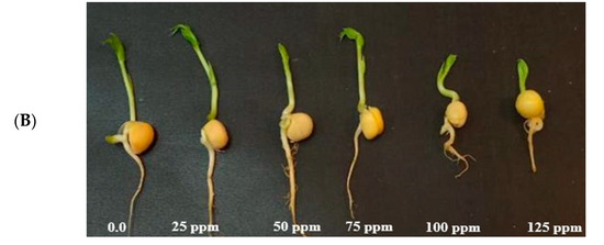 Similar results were noticed in the current investigation when seeds were exposed to CuO NPs at concentrations ranging from 25 ppm to 125 ppm. This resulted in delays in P. sativum seed germination during intervals of 24 h, 48 h, and 72 h. It might be one of the factors responsible for inhibiting seed germination in the present study.