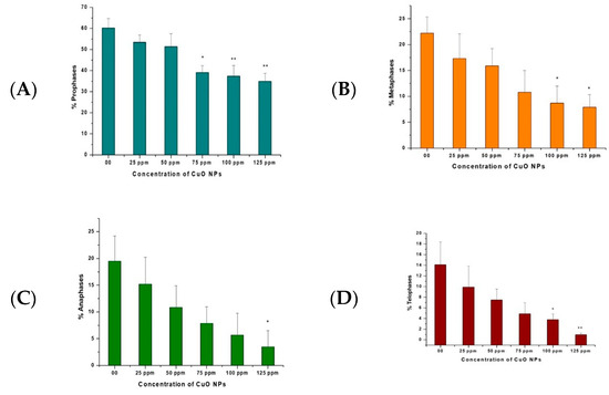 The effects of CuO NPs on CPK of pea root tip cells (RTCs) are depicted in Figure 5A–D. In the control, treatment with DDW for 2 h showed a rise in prophase, metaphase, anaphase, and telophase. A marginal decline was reported at 25 ppm to 125 ppm of CuO NP-treated root tips for 2 h.