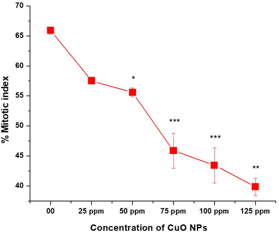 CuO NPs showed cytotoxicity in this study by reducing the MI dose-dependently. This demonstrates that CuO NPs have a mito-depressive effect in the pea. Various studies have shown that a decrease in cell action might be because of the variations in the duration of the mitotic cycle. Some authors have ascribed the mitotic inhibition to a rise in the duration of the S phase [59,60]. A reduced percentage of MI may result from disrupted cell cycle progression, such as G1-S and S-M phases, with exposure to CuO NPs. According to Das et al. [61], NPs can access DNA through nuclear pores or when the nuclear membrane dissolves in cells going through mitotic division. According to Jing-Jing [59], the MI reacts to the multiplying capability of a region where cells divide actively, but it diminishes during exposure to hazardous substances showing cytotoxicity.