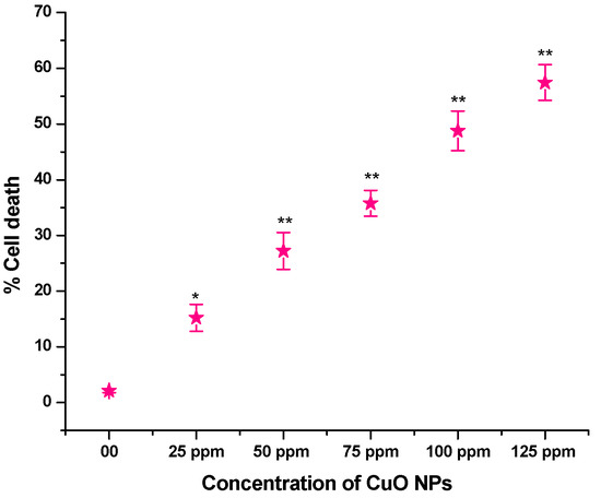 CuO NP-induced genotoxicity was further demonstrated by the existence of micronuclei in the PMC cells of pea. The number of MN is drastically raised with a rise in concentrations from 25 to 125 ppm following a 2 h treatment with CuO NPs. It is still unclear how exactly NPs cause micronuclei to form. On the other hand, acentric fragments or lagging chromosomes that are not included in the complete genetic complement during mitosis result in the development of micronuclei. According to Hosseinpour et al. [65], the nuclear membrane mimics the nucleus proper as it organizes around the excluded region. MN generation suggested a mutagenic effect ensuing from unrepaired damage or incorrectly repaired damage in parental cells [66], caused by CuO NPs. Other researchers have documented analogous genotoxic effects of CuO NPs and Vicia faba, Glycine max, Allium cepa, and Triticum sativum [67,68].