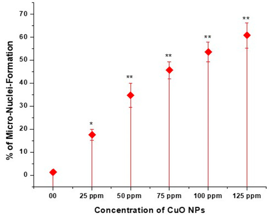 Effect on MNF of pea treated with CuO NPs for 2 h. * p < 0.05; ** p < 0.01. % are mean of three replicates ± SE, 0.0 = control group.