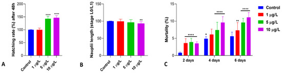 Exposure of the cysts to DLZ induced a significant dose-dependent increase in the hatching percentage compared to the control (Figure 1A). At the environmental concentration, the percentage remained at values comparable to that of control samples (about 23% of cysts, assumed as 100% of hatching), but in samples exposed to 5 and 10 µg/L, the percentage rose to 142 and 146% (p < 0.0001), with an effect size >5. Hatched nauplii, stages L0 to L1 (Figure S1), were significantly shorter at the higher DLZ concentrations compared to controls and DLZ 1 µg/L (p < 0.01; effect size 0.1, 0.6, and 1.5, respectively; Figure 1B). In control samples, mortality remained below 6%, a value registered on day 6 dph (Figure 1C). In treated samples, mortality increased significantly, dose-dependently, compared to the controls (Figure 1C). Maximum values, registered at 6 dph, however, remained close to 10%, the value indicated by Vanhaecke et al. (1981) [37] as acceptable at 2 days of treatment. The effect size at 2 days was <1.6 and >4.3 at 4 and 6 days, respectively.