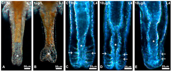 No significant alterations in the general body plan or appendages (Figure S1) were noticed during development in control nauplii or nauplii exposed to the three different concentrations of DLZ. All nauplii at stages L0, L1, and L2 had short, non-differentiated bodies containing a recognisable, dense, and yellowish gut. The head was characterised by a median naupliar eye and two pairs of antennae. At stage L3, the body was elongated, less dense, and eventually showed the first traces of thoracic segmentation. The development of thoracopod buds identified the L4 stage. These initially appeared as flat, short lateral protrusions that progressively lengthened and specialised. In DLZ-treated nauplii, alterations were observed at the level of the posterior region of the abdomen. No matter the concentration of DLZ, in about 0.5% of nauplii, it was dilated (Figure 3B) compared to the controls (Figure 3A). In addition, in about 30% of nauplii, the ligaments (Figure 3C) appeared poorly organised (Figure 3D) or moderately disorganised (Figure 3E).