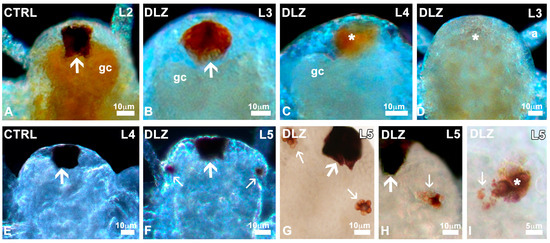 In controls and treated nauplii, paired eyes, absent in stage L4 (Figure 4E), began to develop at the L4/L5 transition stage (Figure 4F). In controls and DLZ-treated nauplii, the two buds initially showed a different pigmentation (Figure S5) but rapidly developed, becoming well pigmented, appearing as a blackberry in both controls and most DLZ-treated nauplii (Figure 4G). In the latter group, however, no matter the concentration, abnormal paired eyes were occasionally (<5% of nauplii) observed; cells were irregularly pigmented (Figure 4H), or pigment appeared dispersed outside the eye contour (Figure 4I).