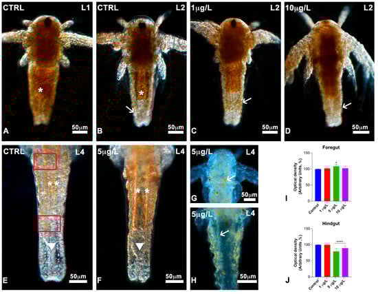 Lipid distribution during development in Artemia salina nauplii exposed to DLZ. (A) Dense, fat body (*). (B) Fat (*) decreases in the posterior abdomen and the hindgut (arrow). (C,D) Dense posterior abdomen (arrows). (E) Detail of the posterior abdomen; notice the dispersed yolk globules (**); hindgut region (arrowhead) completely devoid. In red, the areas in which absorbance was measured. (F) Detail of the posterior abdomen; presence of many yolk globules in the fore- (**) and hindgut (arrowhead) areas. (G,H) Presence of few, large yolk globules (arrows). Fixation in 4% formalin, no staining, in toto observation under incident light at different angles. Bars: 50 µm. (I,J) Optical density (grey values) measured in the areas indicated in red, in (E). Greyscale values: 0 = black; 256 = white. Two-Way ANOVA followed by Tukey’s pairwise comparison test; * p < 0.05; **** p < 0.0001. Number of animals examined: (I,J), n = 40 nauplii/treatment/gut area.