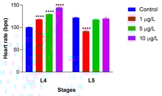 The mean heart rate measured in control L4 and L5 (Figure 6) nauplii was 100 ± 4.4 and 121 ± 6.9 beats per minute. In L4 nauplii exposed to DLZ, the beat number rose dose-dependently, from 117.6 ± 4.7 in 1 μg/L to 129.2 ± 4.0 and 144.1 ± 5.7 in 5 and 10 μg/L, respectively.
