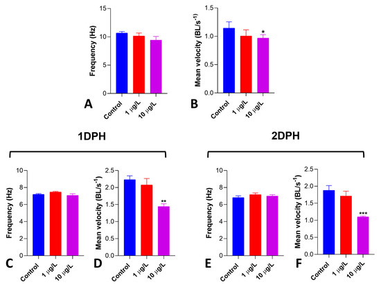 In 2 dph nauplii obtained from cysts exposed at hydration (pre-hatching), DLZ had no effects on the antennal stroke frequency (Figure 7A). At the same time, it significantly reduced the mean velocity by about 35% at 10 µg/L (Figure 7B). In nauplii treated with DLZ at 1 (Figure 7C,D) or 2 days post-hatching (Figure 7E,F), similar results were obtained. No effects were registered on antennal stroke frequency (Figure 7C,E), while a significant reduction in mean velocity was observed at 10 µg/L (35% and 42% on 1 dph and 2 dph nauplii, respectively) (Figure 7D,F).
