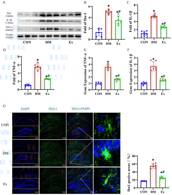The impact of exercise on hippocampal neuroinflammation in diabetes. (A) Representative Western blot images of Iba1, IL-1β, and TNF-α expression in the hippocampus. (B–D) Quantification of Iba1, IL-1β, and TNF-α expression in the hippocampus of the mice. (E,F) Relative mRNA levels of TNF-α and IL-1β in the hippocampus of the mice. (G) Representative confocal images of Iba1 (green) and DAPI (blue) staining in the hippocampus, accompanied by the area of positive area expression of Iba1 (%). Scale bar = 500 µm. n = 6 mice per group. Data are represented as ± SD. * denotes significance (p < 0.05) compared to the Con group. # denotes significance (p < 0.05) compared to the DM group.