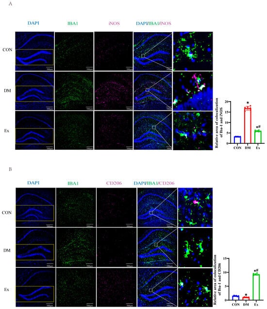 Microglial cells are the brain’s innate immune cells that help maintain the central nervous system’s balance by detecting and eliminating pathogens and exhibiting anti-inflammatory effects [54]. However, prolonged exposure to high blood sugar levels and metabolic dysfunction can lead to the accumulation of pathological microglial cells and the excessive production of pro-inflammatory cytokines [13,55]. Reversing the pro-inflammatory phenotype (M1 microglia) to an anti-inflammatory pattern (M2 microglia) is suggested as an effective way to reduce neuroinflammation. Therefore, we investigated whether exercise could shift the microglial pattern from M1 to M2 in diabetic mice. Our findings indicated that, in comparison to the control group, the Iba1+iNOS+ positive area in diabetic mice was significantly increased, whereas exercise intervention markedly decreased these cell numbers (Figure 3A). Conversely, we observed that the Iba1+CD206+ positive area in the exercise group of diabetic mice was significantly higher than in the diabetic group (Figure 3B). These results suggest that exercise may protect the hippocampal microenvironment in diabetic mice by promoting the transition of microglial cells from an M1 pro-inflammatory phenotype to an M2 anti-inflammatory phenotype.