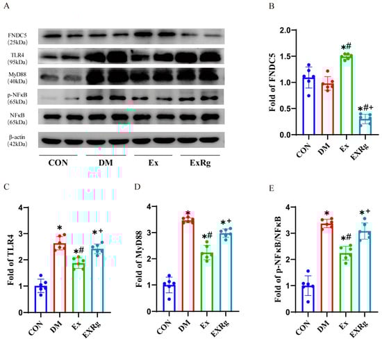 Injection of cyclo RGDyk reverses the beneficial effects of exercise-induced irisin on the hippocampus in diabetes. (A) Representative Western blot images of FNDC5, TLR4, MyD88, and p-NF-κB/NF-κB expression in the hippocampus. (B–E) Quantification of FNDC5, TLR4, MyD88, and p-NF-κB/NF-κB expression in the hippocampus of the mice. Data are represented as ± SD. n = 6 mice per group. * indicate significance (p < 0.05) compared to the CON group, # denote significance (p < 0.05) compared to the DM group, and + denote signify significance (p < 0.05) compared to the Ex group.