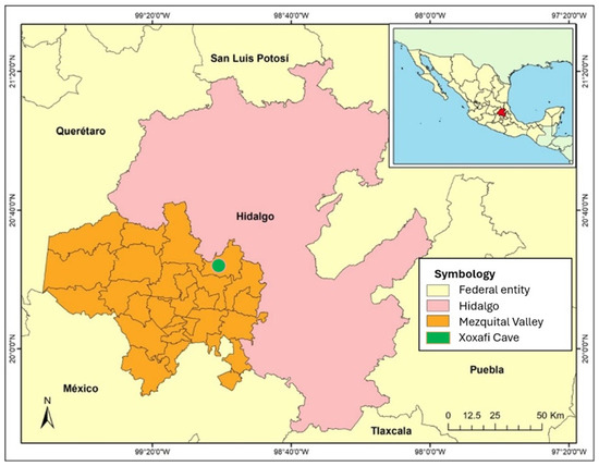 The Mezquital Valley is a hydrographic and cultural region located in the western part of the state of Hidalgo and is part of the Pánuco River basin (Figure 1). Its proximity to cinnabar deposits in the Sierra Gorda suggests that it receives sediments with high Hg content. The local climate is semi-arid with summer rains (BSkwg and BShwg), and the predominant vegetation comprises Prosopis sp., Larrea sp. and Yucca filifera, which form a mosaic of xeric scrub. One of the largest caves in the region is the Xoxafí grotto (coordinates: 20.388334 N, −99.027623 W, 2229 masl), which is a refuge for large colonies of nectarivorous and insectivorous bats [10]. Local agriculture is mostly represented by alfalfa, corn and oats, which together represent 83% of the total planted area. This agricultural system has resorted to the use of the largest system of urban wastewater reuse for irrigation in the world and uses pesticides, some of which contain mercury [13]. The Mezquital Valley also has intense industrial activity, such as the Tula oil refinery and five cement plants, one of which is in the vicinity of Xoxafi. It has been shown that metal contamination in this region has caused health problems in human populations, such as ophthalmic conditions and methemoglobinemia [14] (pp. 257–277).