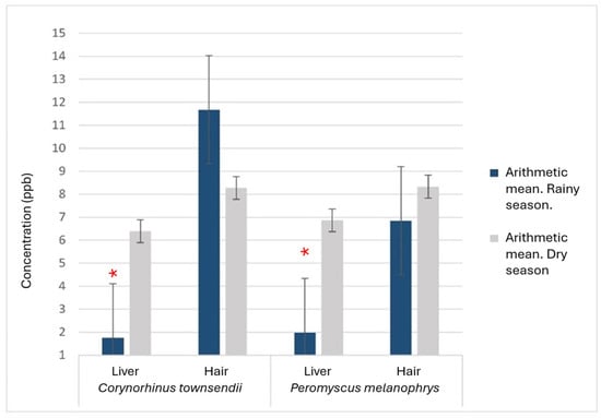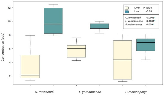 The general comparison among the three species showed that although the highest values were recorded in C. townsendii (Figure 2), the mean concentration of mercury did not differ significantly among taxa (p = 0.528). When comparing between the two matrices using all species and seasons, we found significantly higher mercury concentrations in hair than in liver (p = 8 × 10−8). When comparing hair mercury concentration among the three species, although the highest mean contents were recorded in the hair of C. townsendii (an insectivore), followed by that of L. yerbabuenae and P. melanophrys (primary consumers), the difference among species was not significant (p = 0.341), consistent with the test considering grouping hair and liver values. Similarly, there was no significant difference among the three species in liver mercury (p = 0.492).