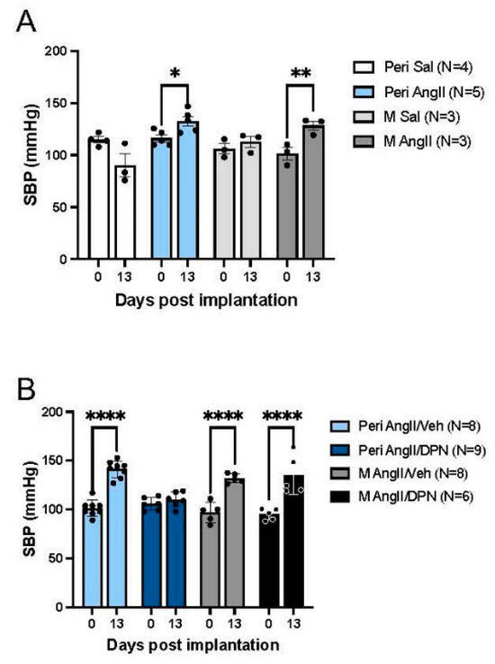 Slow-pressor AngII administration and blood pressure recording: Osmotic mini-pumps (Alzet, Durect Corporation, Cupertino, CA, USA) containing AngII (600 ng/kg−1/min−1) in vehicle (0.1% bovine serum albumin (BSA) in saline, termed Saline [Sal]) or the vehicle alone were implanted subcutaneously under isoflurane anesthesia [8,17,18]. Systolic blood pressure (SBP) was measured in awake mice by tail-cuff plethysmography (Model MC4000; Hatteras Instruments, Cary, NC, USA). Mice were tested two days before mini-pump implantation, followed by testing at days 2, 5, 9 and 13 after pump implantation (Figure 1B). To control for possible handling effects, mice were euthanized one day after the final SBP measurements (i.e., day 14).