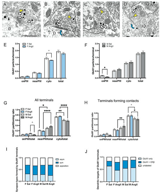 GluN1-SIG containing terminals in males and peri-AOF females from Sal and AngII-infused mice. (A–D) Representative electron micrographs showing the subcellular localization of GluN1-SIG particles in axon terminals of peri-AOF female and male mice infused with Sal or AngII. D = dendrite; Yellow arrowhead = nearPM SIG; arrows = cytoplasmic SIG. Curved grey arrows = appositions (A,C); Curved blue arrows = symmetric synapse (B,D). (E) Sal and AngII-infused peri-AOF female mice have similar numbers of presynaptic GluN1-SIG particles onPM, near PM and in total. AngII-infused females compared to Sal-infused females tended to have lower numbers of presynaptic GluN1-SIGs in the cytoplasm. (F) AngII-infused male mice showed a significant decrease in the number of presynaptic onPM GluN1-SIG particles compared to Sal-infused males. (G) Peri-AOF female mice had a significantly lower partitioning ratio of presynaptic nearPM GluN1-SIG compared to males. Conversely, peri-AOF females displayed a significantly greater ratio of cytoplasmic GluN1-SIG compared to males. AngII-infused peri-AOF females compared to AngII-infused males had a significantly smaller ratio of nearPM GluN1 SIGs and a significantly greater ratio of cytoplasmic GluN1-SIGs. (H) Of the GluN1-labeled axon terminals that formed dendritic contacts (appositions, asymmetric and symmetric synapses), AngII-infused peri-AOF females showed a significantly decreased ratio of presynaptic nearPM GluN1-SIG and a higher ratio of presynaptic cytoplasmic GluN1-SIG compared to AngII-infused males. Sal-infused peri-AOF females tended to have an increased ratio of cytoplasmic GluN1 to Sal-infused males. (I) Bar graph showing the proportion of terminals in each group forming appositions, asymmetric or symmetric synapse with dendrites. asym: asymmetric synapse, sym: symmetric synapse. (J) Bar graph showing the proportion of unlabeled, single, and dual-labeled dendritic profiles that were targets of GluN1-containing terminals. * p < 0.05; ** p < 0.01; **** p < 0.001, ^ p = 0.06.