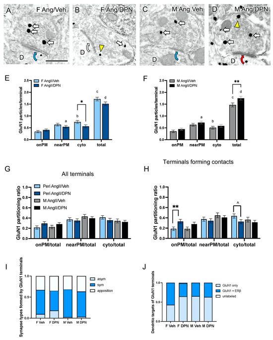 GluN1-SIG containing terminals in males and peri-AOF females from AngII-infused mice co-administered DPN. (A–D) Representative electron micrographs showing the subcellular localization of GluN1-SIG particles in axon terminals of AngII-infused peri-AOF female and male mice co-administered with vehicle or DPN. D = dendrite; Yellow arrowhead = nearPM SIG; arrows = cytoplasmic SIG. Curved blue arrows = symmetric synapse (A,C); Curved grey arrow = apposition (B), and Curved red arrow = asymmetric synapse (D). (E,F) After DPN administration, AngII-infused peri-AOF female mice showed a decreased number of cytoplasmic GluN1-SIG per terminal, while AngII-infused males had an increased total per terminal. AngII-infused peri-AOF females demonstrated a greater total number of GluN1-SIG particles per terminal as well as a greater number of cytoplasmic GluN1 SIG particles compared to males. When comparing DPN-injected peri-AOF females and matched males, there were lower numbers of near plasmalemmal and total GluN1-SIG particles. (G) The partitioning ratios of GluN1-SIGs showed no significant between-group differences in any cellular compartment in terminals. (H) Of the GluN1-labeled axon terminals that formed dendritic contacts (appositions, asymmetric and symmetric synapses), AngII-infused peri-AOF females given DPN had a significantly increased ratio of onPM GluN1 SIG particles compared to Veh females. (I) Bar graph showing the proportion of terminals in each group forming appostions, as well as asymmetric or symmetric synapse with dendrites. (J) Bar graph showing the proportion of unlabeled, single, and dual-labeled dendritic profiles targeted by GluN1-containing terminals. * p < 0.05; ** p < 0.01; ^ p = 0.06; a,b,c,d: p < 0.05.