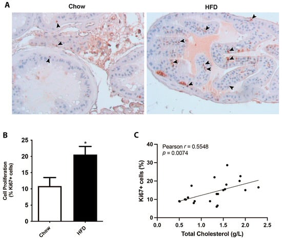 Hypercholesterolemia induced by a high-fat diet promotes cell proliferation in the prostate gland. Mice were fed on a HFD for 12 weeks and their prostates were processed and analyzed by Ki-67 immunohistochemistry. (A) Representative images of prostate glands immunostained for the proliferation marker Ki-67 showing an increase in HFD-fed mice (brown nuclei, arrowheads). (B) Quantification of Ki-67-positive stromal cells in ventral prostates from chow- or HFD-fed mice (mean ± SEM; n = 10 per group; * p < 0.05). (C) Correlative analysis showing serum cholesterol levels and prostatic Ki-67 positive counts (n = 20, Pearson’s correlation test).