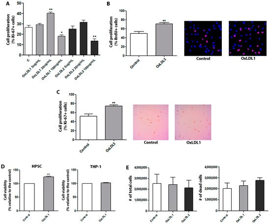 BPH is the most frequent condition associated with pathological growth of the prostate [] and it has been suggested to be sustained by dyslipidemia/hypercholesterolemia []. Considering that the oxidized form of the LDL is a key pathogenic effector in dyslipidemic contexts [], we aimed to evaluate how prostatic cells from BPH patients respond to OxLDL To this end, we first established primary cultures of stromal cells from eight patients, identified as HPSC-1, HPSC-2, HPSC-3, HPSC 4, HPSC-5, HPSC 6, HPSC-7, and HPSC-8. Following 15 days of growth, these HPSCs exhibited a spindle-shaped morphology and a well-developed cytoskeleton; ultrastructural and histochemical analyses demonstrated a myofibroblastic profile in these primary HPSCs (Figure S1). The effects of OxLDL1 (moderately oxidized) and OxLDL2 (highly oxidized) on HPSCs were then compared at several concentrations. As shown in Figure 2A, 100 µg/mL OxLDL exhibited substantial toxicity for both types, resulting in low cell viability and reduced proliferation. On the other hand, 5 µg/mL of both did not induce significant changes in cell viability, apoptosis, and proliferation compared to controls. When stimulated with a 20 µg/mL concentration, HPSCs showed a significant increase in cell proliferation in response to both OxLDL1 and OxLDL2 compared to controls. However, this concentration also led to elevated cell death for OxLDL2, as observed in primary cultures during the treatment phase (Figure 2A). Based on these findings, 20 µg/mL of OxLDL1, the moderately oxidized form, was selected for all subsequent experiments. Accordingly, HPSCs stimulated by OxLDL1 for 24 h exhibited an increase in cell viability and cell proliferation, as determined by resazurin absorbance and BrdU assay (Figure 2B), as well as by Ki-67 immunocytochemistry (Figure 2C) in the eight primary cultures. To check the specificity of these effects in cell proliferation, the monocytic THP-1 cell line, which is typically used for studying LDL effects, was treated with OxLDL1 and OxLDL2 at a concentration of 20 µg/mL for 24 h. Despite being uptaken by THP 1 cells (Figure S2), OxLDL did not promote significant changes in cell viability (Figure 2D) or proliferation (Figure 2E) in this cell line.
