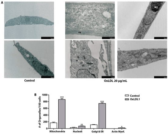 OxLDL causes morphological and ultrastructural changes in HPSCs. (A) Ultrastructure of HPSCs derived from patient HPSC-1, treated with OxLDL1 at 20 µg/mL for 24 h, and evaluated by TEM. Cells stimulated by OxLDL display frequent actin filaments (FAs), dilated endoplasmic reticulum (ER), numerous mitochondria (M), Golgi apparatus (G), and prominent nucleoli (NLI). (B) Quantification of organelles observed by TEM for HPSCs from patient HPSC-1, control vs. treated with OxLDL1 at 20 µg/mL for 24 h. There was a significant increase in the number of mitochondria (*** p < 0.001), nucleoli (** p < 0.01), Golgi and endoplasmic reticulum (*** p < 0.001), and actin myofibrils (* p < 0.05) when stimulated by OxLDL1 compared to the control. All tests were performed in two replicates, each in triplicate. Bars represent mean ± SEM.