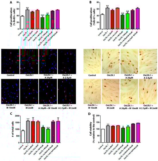 Metformin inhibits the proliferative effect of OxLDL on HPSCs. Cells were stimulated with 20 µg/mL of OxLDL1, and atorvastatin, metformin, or a combination of both were used as co-stimuli, each at low and high doses for 24 h. (A) Cell proliferation assays by BrdU incorporation were carried out in all primary cultures of HPSCs. Images of cells are representative of patient HPSC-6. OxLDL1 enhanced cell proliferation compared to the control (** p < 0.01), while metformin inhibited the proliferative effect induced by OxLDL1 (ΔΔ p < 0.01 and ΔΔΔ p < 0.001 vs. OxLDL1). (B) A similar effect was observed by Ki-67 immunocytochemistry analysis on HPSCs. Representative images of cells are from the same patient HPSC-6 (** p < 0.01 for OxLDL1 vs. C, and ΔΔ p < 0.01 for metformin vs. OxLDL1). (C) Determination of the total cell number was performed on cells from patient HPSC-5, HPSC-6 and HPSC-7. OxLDL1 increased the cell number compared to the control (*** p < 0.001), while metformin reduced the cell number compared to OxLDL1 (Δ p < 0.05 and ΔΔ p < 0.01). (D) Cell viability assay evaluated by resazurin absorbance was performed on cells from patient HPSC-5, HPSC-6 and HPSC-7. All the tests were performed in two replicates, each in triplicate. Bars represent mean ± SEM.