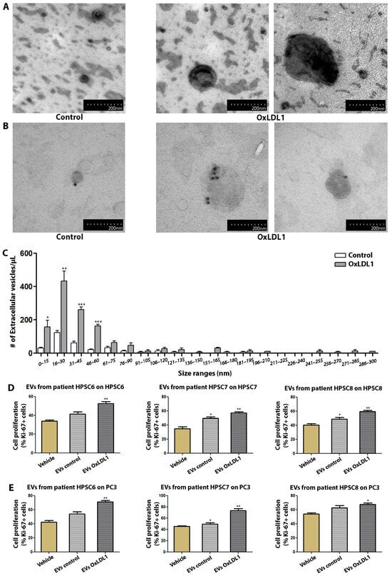 EVs derived from OxLDL-stimulated HPSCs exert a pro-proliferative effect on prostatic cells. (A) Images of HPSCs-derived EVs from patient HPSC-4, treated with OxLDL1 at 20 µg/mL for 24 h, isolated by ultracentrifugation and visualized by TEM. (B) Immunolabeling for CD63 in EVs derived from patient HPSC-4, using colloidal gold particles. (C) The histogram of size range distribution of EVs derived from HPSCs of patient HPSC-4 shows an increase in the number of EVs, mainly in the smaller size ranges (* p < 0.05, ** p < 0.01 and *** p < 0.001 vs. control). EVs obtained from HPSCs stimulated with OxLDL1 at 20 µg/mL for 24 h (EVs OxLDL1) and the control (EVs control) were used as stimuli on HPSCs from the same patient (D) and on prostatic epithelial cells from the PC3 line (E). EVs from OxLDL-stimulated HPSCs induced a significant proliferative effect on HPSCs and PC3 cells in all assays (** p < 0.01 and * p < 0.05 vs. vehicle). The proliferative effect was evaluated by Ki-67 and all tests were performed in three replicates, each in triplicate. Bars represent mean ± SEM.