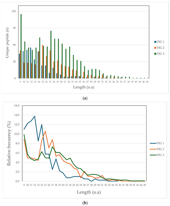 Altogether, 1990 unique peptides were identified (1.9% being peptides derived from bacterial presentation), having less than 10 ppm, 1% FDR, and being more than 9 aa in length, distributed as follows: 372 for Pig 1 (Lr-0.23), 438 for Pig 2 (Lr.0.12) and 1180 for Pig 3 (Lr.0.21). It was observed that peptide length obtained in this study was up to 36 aa for Pigs 1 and 2 and 49 aa for Pig 3. Figure 1 illustrates peptide frequency (a) and proportion (b); it was found that peptides having 9, 14, and 17 aa lengths had greater representation concerning both parameters, mainly regarding Pigs 2 and 3. Greater frequency and proportion were found for Pig 1, peptides having lengths between 10 and 14 aa.