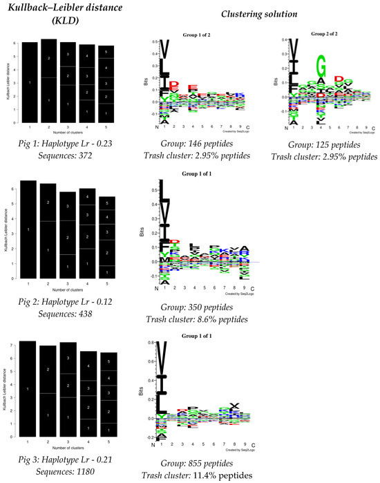 The GibbsCluster 2.0 server was used for analysing the data obtained from each experiment; the deconvolution motifs were analysed as mentioned above. The highest Kullback–Leibler distance (KLD) was considered for selecting the best solution, represented by the GibbsCluster server’s Seq2Logo. Two solutions were observed for Pig 1, and a single solution was found for the other two pigs in the study (Figure 2). Regarding Pig 1, different aa preferences were identified in anchor positions P1, P4, and P6 in both solutions, and additional differences were also found in P2 and P7. Pig 2 data revealed aa preferences in positions P1, P4, P6, and P9, accompanied in turn by preferences in positions P2, P7, and P8. Notably, aa preferences stood out in anchor positions P1 and P4 for Pig 3, while preferences were also observed for positions P3, P7, and P8.