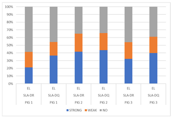 NetMHCIIpan-4.0, using artificial neural networks (ANNs), predicted a greater number of eluted ligands for MHC II, SLA-DR, and SLA-DQ molecules (organised in Table 3), mainly for Pig 2 having haplotype Lr.0.12. In turn, the predicted elution ligand percentage results were compared for each dataset analysed, considering SLA-DR and SLA-DQ (Figure 3); a fair percentage of elution was predicted for the peptides analysed in the three pigs, particularly peptides from Pig 2 (haplotype Lr-0.12), which had a greater percentage of eluted ligands (<1%) compared to that for the other two pigs. A higher %prediction of ligands eluted by SLA-DQ was observed in the three pigs, and by SLA-DR to a lesser extent, mainly in Pig 1 (haplotype Lr-0.23). Class II molecule binding was predicted, observing that the Pig 2 haplotype (Lr-0.12) had the greatest number of peptides having strong binding (<1%) (Table S23 and Figure S19).