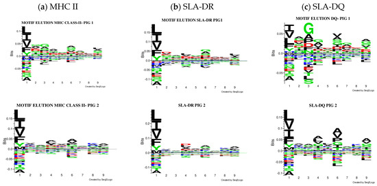 Comparison of the logos obtained, considering only peptides predicted to be eluted ligands (EL < 5%Rank). All the results were considered for creating the MHC II (a), SLA-DR (b), and SLA-DQ (c) logos for each pig.