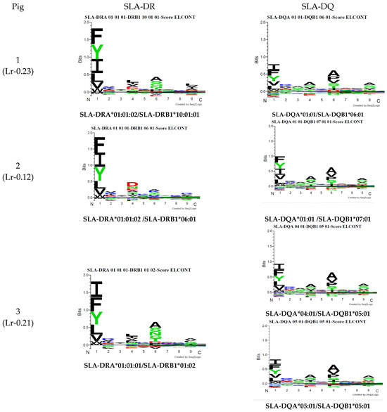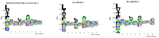Variations were observed in both neural networks when predicting binding specificities. The MixMHC2pred interface can obtain MHC-II motifs for any MHC-II allele, considering alpha- and beta-chain amino acids [20]. All haplotype combinations were thus selected, considering alpha alleles reported to date as such information can lead to predicting the presentation of MHC class II ligands and CD4+ T-cell epitopes (http://mixmhc2pred.gfellerlab.org/; accessed on 21 July 2024). The SLA-DR allele results coincided regarding binding specificities similar to that for other species; however, for SLA-DQ, differences were observed concerning binding specificities in the peptides’ preferred anchoring positions (especially in Pocket 3).
