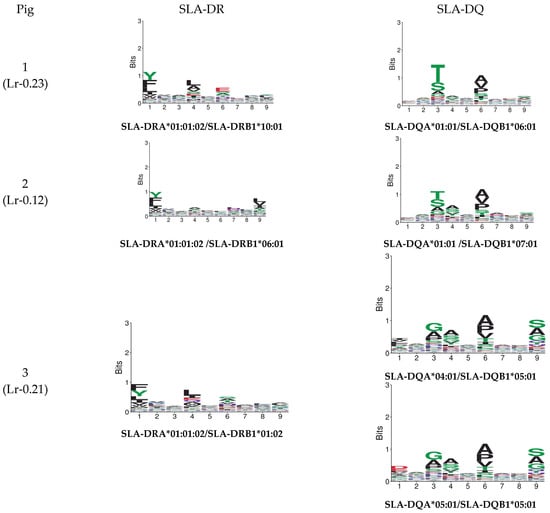 The Seq2Logo server predicted logos for peptides having the best elution percentages (organised in Figure 4). Each MHC II molecule’s contribution was predicted, considering eluted ligands having less than 5% value in all the pigs analysed. Similarly, affinity logos were predicted, and a similar pattern was observed (Figure S20).