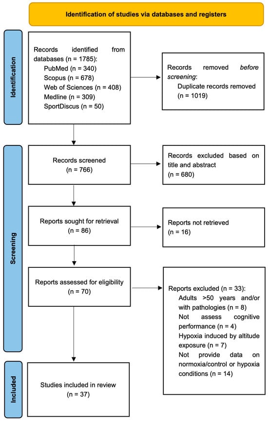 The selection of studies was based on the following inclusion criteria: (1) experimental studies involving a hypoxia intervention induced by a hypoxic air generator to determine the effects on cognitive performance and (2) conducted on healthy adults (i.e., males and/or females; aged 18–50 years; without pathologies or health/mental problems). We excluded articles meeting at least one of the following exclusion criteria: (1) were review articles, editorials, letters to the editor, or case reports; (2) were conducted in animals, cadavers, or in vitro; (3) did not provide data on normoxia/control or hypoxia conditions; (4) hypoxia was induced by altitude exposure; or (5) were observational studies that did not apply any type of hypoxia intervention.