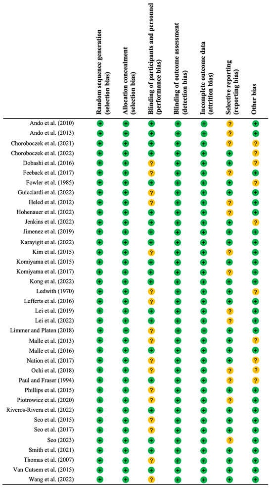 Overall assessment of risk of bias. Note: If a study’s scores are “+” in all subdomains, the overall rating is “low risk of bias”. When a study’s scores are “?” in one or more subdomains, the overall rating is considered “some concerns”. If a study’s scores are “-” in one or more subdomains, the overall rating is “high risk of bias”, giving rise to substantial doubts about the quality of the research [,,,,,,,,,,,,,,,,,,,,,,,,,,,,,,,,,,,,].