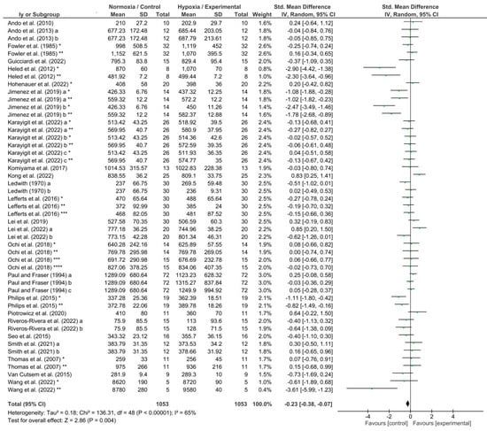 Forest plot of studies evaluating the effects of acute hypoxic exposure in simulated altitude on reaction time. a, b, and c, different hypoxia exposures; *, **, ***, and ****, different reaction time tests [,,,,,,,,,,,,,,,,,,,,,,,].