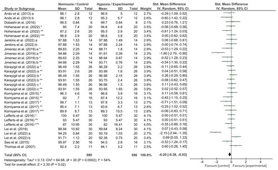Forest plot of studies evaluating the effects of acute hypoxic exposure in simulated altitude on response accuracy. a, b, and c, different hypoxia exposures; *, **, and ***, different response accuracy tests [,,,,,,,,,,,,].