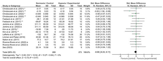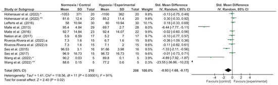 Means ± standard deviation (SD) of outcomes under normoxia and hypoxia conditions were collected. Review Manager software (RevMan. Version 5.3. Copenhagen: Nordic Cochrane Centre, Cochrane Collaboration, 2014) was used for statistical analysis of the data. Four meta-analyses were performed: (1) reaction time; (2) accuracy response; (3) memory, and (4) attention. To assess heterogeneity between studies, the chi-square test and the Higgins I2 test were used []. The I2 ranges from 0% to 100%, where 0% indicates that no heterogeneity was observed, <25% indicates a low level, 25–75% indicates a moderate level, and >75% indicates a high level of heterogeneity [,]. Pooled odds ratios with 95% CI were calculated and a random-effects model using the Mantel–Haenszel method was used to pool the results of the different studies. The SMD and 95% CI were also used for the analysis of continuous data [] and were interpreted as follows: trivial, <0.2; small effect, 0.2–0.5; moderate effect, 0.51–0.8; and large effect, >0.8 []. Statistical significance was set at p < 0.05.
