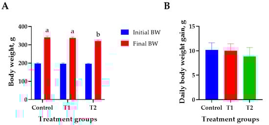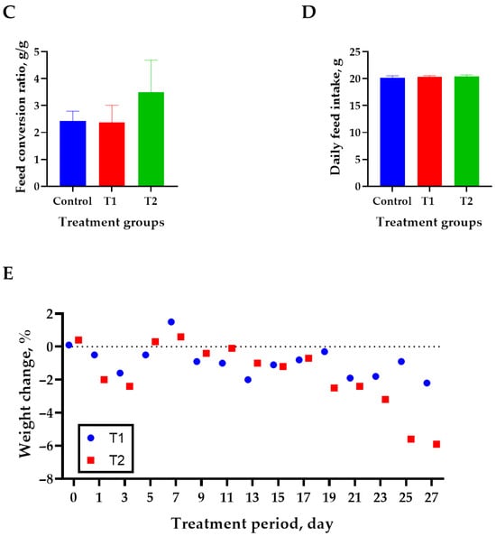The effects of DON treatment on the growth performance of 6-week-old rats over 28 days are shown in Figure 1. The initial body weight (194 ± 2.8 g) did not differ significantly among the treatment groups. The T2 (0.2 mg/L) group showed the lowest final body weight (320 ± 4.2 g) than that of the control (340 ± 6.9 g) on day 27 (p < 0.05, Figure 1A). However, the ADG, FCR, and ADFI did not differ significantly among the treatment groups (Figure 1B–D). Weight change during the study was reduced by 0.9% at T1 and 5.9% at T2 compared to the control (Figure 1E).