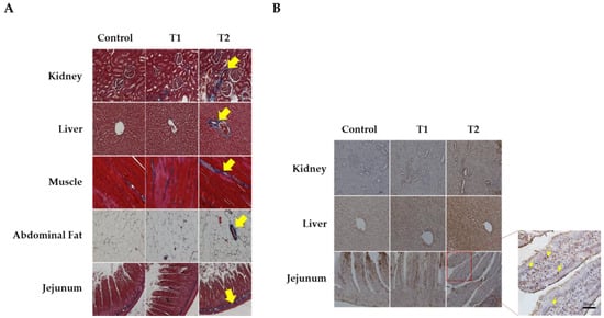Images of fibrosis and apoptosis in DON-contaminated rats after 4 weeks from the start of the experiment. (A) Representative figure of fibrosis observed in the kidney, liver, muscle, adipose tissue, and jejunum by Masson’s trichrome staining according to the DON level. (B) Representative apoptotic figures were observed in the kidney, liver, and jejunum by TUNEL staining according to DON levels. Treatment group: Control, basal diet; T1, basal diet + 0.02 mg/kg DON; T2, basal diet + 0.2 mg/kg DON. The arrows indicate apoptosis and fibrosis. Observations were performed at 200× magnification.