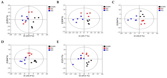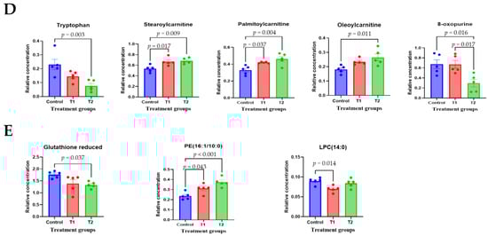 The scatter and bar graph of important variables in the projection of metabolites in five different tissues. (A–E) Blood, cecum, feces, kidney, and liver, respectively. Metabolites in five different tissues were significantly different in the ANOVA model based on mean comparison using Tukey’s test. Treatment groups: Control, basal diet; T1, basal diet + 0.02 mg/kg DON; T2, basal diet + 0.2 mg/kg DON.