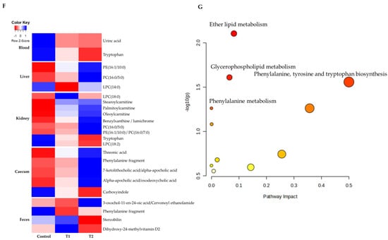 Metabolite profiling of blood, cecum, feces, kidney, and liver from DON−contaminated rats. (A–E) PLS-DA score plot of blood (A), cecum (B), feces (C), kidney (D), and liver (E). (F) Heatmap of the changes in metabolites related to DON levels. The blue color represents an increasing trend, and red represents a declining trend. (G) It represents the results of metabolic pathways in different DON treatment groups. Variations in score plots were defined using a 95% confidence interval. The heatmap shows the significantly different data visualization of multiple parameters. Treatment groups: Control, basal diet; T1, basal diet + 0.02 mg/kg DON; T2, basal diet + 0.2 mg/kg DON.