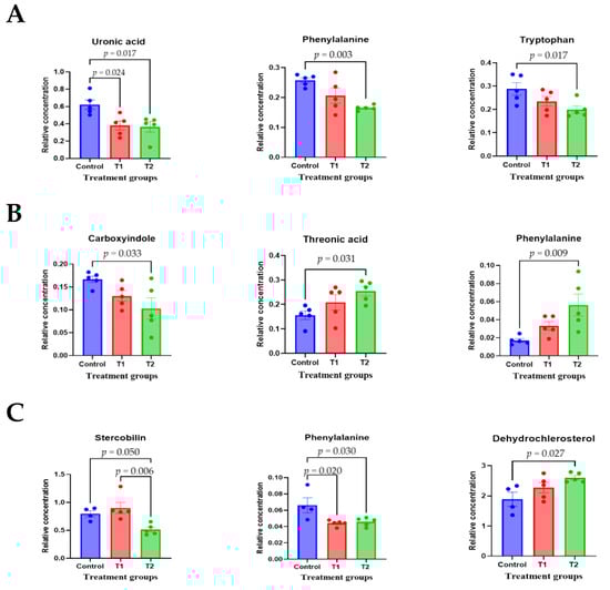 To comprehensively understand DON’s effect on metabolism, we characterized the metabolites in different rat tissues using liquid chromatography-mass spectrometry. Partial least squares discriminant analysis (PLS-DA) showed a distinct separation of metabolites in the DON-treated groups compared to the control (Figure 3A–E). DON-induced metabolites were separated between the control and treatment groups in all tissues. Particularly, the cecum, feces, and kidneys were different in all groups. As shown in Figure 3F, a heat map was generated by hierarchical Pearson clustering of selected blood, liver, kidney, cecum, and fecal metabolites. The heat map result indicated that DON shows changes, including amino acids, lipids, and carbohydrates in blood and tissues (p < 0.05). Some metabolites in blood and feces were decreased due to DON, whereas most increased levels were observed in the liver, kidney, and cecum. The results showed that the control and the two DON-treated groups differed significantly (FDR rate, p < 0.05). Metabolites without clear KEGG structures were excluded. As illustrated in Figure 3G, the DON-treated group predominantly showed alterations in ether lipid metabolism, followed by glycolipid, phenylalanine, tyrosine, and tryptophan biosynthesis, and phenylalanine metabolism. We performed further statistical analyses of DON contamination in rats to identify the potential tissue-specific biomarkers. Metabolites of all tissues, such as the blood, kidney, liver, feces, and cecum, were significantly changed based on VIP scores > 1.0 and p < 0.05 (Figure 4). Furthermore, significant differences in the metabolite profiles were observed between the DON and control groups. The most significantly differentiating compounds between the control and DON groups were uronic acid, phenylalanine, tryptophan, carbolyindole, threonic acid, stercobilin, dehydrochlorosterol, stearolcartinine, palmitoylcanitine, oleoylcarnitine, 8-oxopurine, reduced glutathione, PE (16:1/10:0), and LPC (14:0). Among the candidate metabolites, phenylalanine was decreased in the blood and feces of the T2 group, whereas it was increased in the cecum. Similarly, a significant decrease in tryptophan levels was observed in both the blood and kidneys. Seven of the significant metabolites were increasedm and nine were decreased in the T2 group compared to the control group.