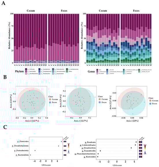 Microbiota profiles from the cecum and feces contents of the three dietary treatment groups at the phylum and genus levels. (A) Bars represent the relative abundance (%) of each phylum (left) and genus (right) level detected per sample. (B) Microbiota beta diversity indices between the two different tissues, including the Bray−Curtis index, unweighted UniFrac distance, and weighted UniFrac distance. (C) Graphical representation of linear discriminant analysis (LDA) effect size (LEfSe) between the two different tissues. The horizontal bar represents the log10−transformed LDA score. The bacterial taxa were statistically significant (p < 0.05) in terms of relative abundance. Treatment groups: Control, basal diet; T1, basal diet + 0.02 mg/kg DON; T2, basal diet + 0.2 mg/kg DON.