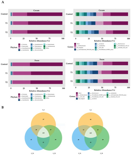 Differentially abundant phyla and genera in the cecum and feces among the DON-treated groups. (A) Bars represent the relative abundance (%) of each phylum (upper-left side) and genus (upper-right side) in the cecum sample, and each phylum (lower-left side) and genus (lower-right side) detected in the feces samples. (B) Venn diagrams showing the core microbiome of genera, shared in the cecum (left) and feces (right) samples. Treatment groups: Control, basal diet; T1, basal diet + 0.02 mg/kg DON; T2, basal diet + 0.2 mg/kg DON.