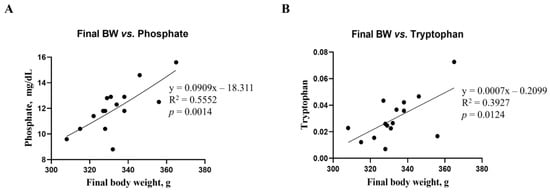 Correlations between final body weight and blood biochemical parameters, as well as metabolites, were analyzed using a linear regression model (Figure 7). The correlations between final body weight and blood biochemical parameters and metabolites were consistent. Phosphate among the biochemical parameters (R2 = 0.5552, p = 0.0014, Figure 7A) and tryptophan among renal metabolites (R2 = 0.3927, p = 0.0124, Figure 7B) showed significant differences from the mean final body weight. However, no differences in microbiota compositions were found in this study.