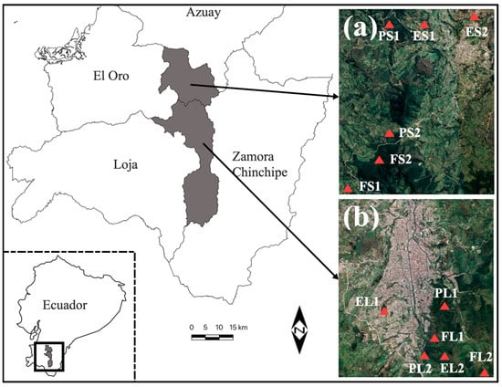Locations of Loja (a). Area 1: Loja Forest (FL), Loja Pinus (PL), Loja Eucalyptus (EL), and Saraguro (b). Area 2: Saraguro Forest (FS), Saraguro Pinus (PS), Saraguro Eucalyptus (ES).