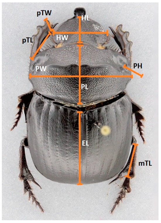 Description of the nine principal traits measured: head width (HW), head length (HL), pronotum width (PW), pronotum length (PL), pronotum height (PH), elytra length (EL), protibia width (pTW), protibia length (pTL), and metatibia length (mTL).