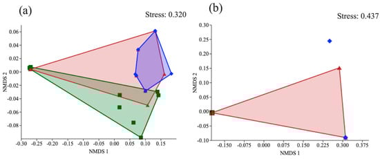 NMDS ordination showed that the dung beetle communities clustered according to land use in two areas: (a) Loja and (b) Saraguro. Colors: green, forest; red, eucalyptus; blue, pinus.