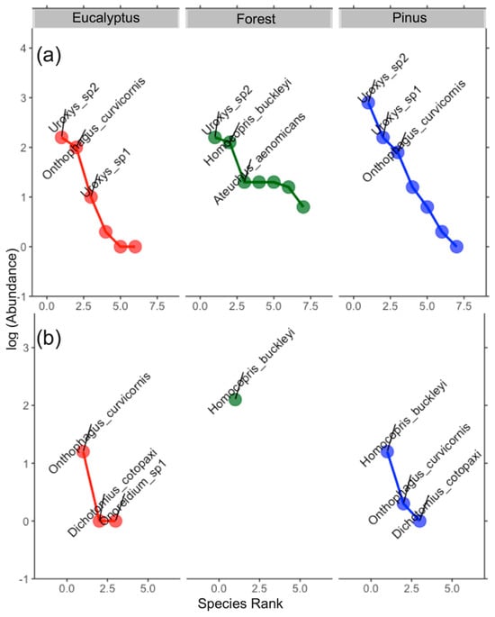 Rank abundance curve of dung beetles in each land use (red = eucalyptus, green = forest and blue = pinus) according to two areas: (a) Loja and (b) Saraguro.