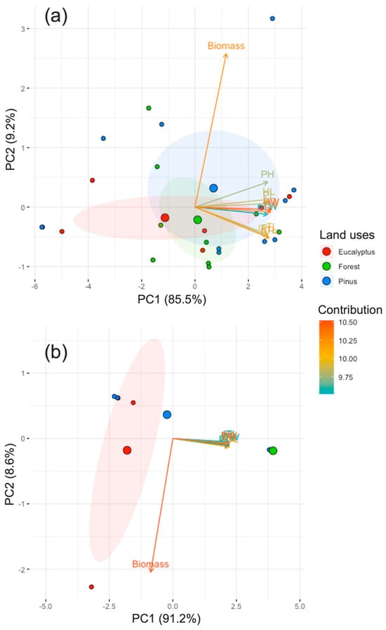 Principal component analysis of 10 morphological traits of dung beetles: head width (HW), head length (HL), pronotum width (PW), pronotum length (PL), pronotum high (PH), elytra length (EL), protibia width (pTW), protibia length (pTL), metatibia length (mTL), biomass, according to areas, (a) area 1 (Loja) and (b) area 2 (Saraguro), and land uses (eucalyptus, forest and pinus).