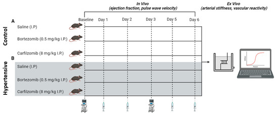 Twelve-week-old C57BL/6J male mice (n = 8 per group) were purchased from Charles River (Ecully, France). Mice were then subjected to experimental protocol A (normotensive “control” mice) or B (L-NAME induced hypertension; Figure 1). All mice were housed in the University of Antwerp’s animal facility in standard cages, maintained under a 12 h light/dark cycle. Mice had unrestricted access to regular chow and tap water. The housing environment was controlled at a constant room temperature of 20–24 °C and a humidity level of 45%. The animal procedures conformed to ARRIVE guidelines and Directive 2010/63/EU of the European Parliament on the protection of animals used for scientific purposes and all experiments were approved by the ethics committee of the University of Antwerp (File 2023-40). Given the common occurrence of cardiovascular comorbidities, such as hypertension, in cancer patients, our objective was to increase the translational significance of our findings by adding a hypertensive mouse model. To induce hypertension, a cohort of mice underwent pre-treatment with L-NAME (2 mg/mL, drinking water) for 7 days preceding the administration of proteasome inhibitors, and maintained throughout the experimental procedure. Mice were randomly assigned to the following groups: vehicle (saline intraperitoneally, I.P.), bortezomib (0.5 mg/kg I.P.), carfilzomib (8 mg/kg I.P.), L-NG-Nitro arginine methyl ester (L-NAME 2 mg/mL + saline I.P.), L-NAME + bortezomib (2 mg/mL + 0.5 mg/kg I.P.) or L-NAME + carfilzomib (2 mg/mL + 8 mg/kg I.P.). I.P. injections were performed on days 1, 2, 5 and 6. The current study’s focus was on the acute treatment effects. Drug dose, treatment duration and route of administration were established based on previous research by Efentakis et al. [17,18]. Therefore, our daily doses following conversion were 0.5 mg/kg bortezomib and 8 mg/kg carfilzomib. For protocols A and B, in vivo evaluation of cardiac parameters by echocardiography was performed on day 0 (baseline) and day 3. At day 6, all mice were sacrificed for ex vivo arterial stiffness and vascular tone analysis.